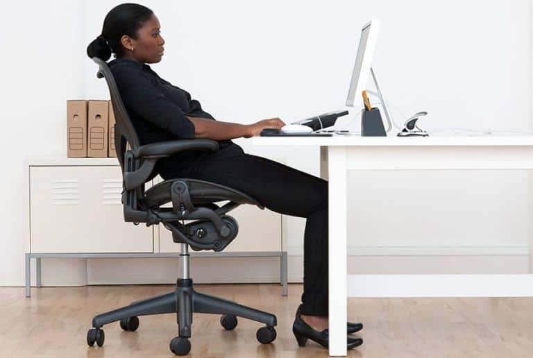 Tip 3: Crossing your legs may not be painful for a short period. However, for 8 hours a day, this is fatiguing to your glute muscles. Imagine hold a bicep curl for 8 hours straight – same idea. Keep your feet flat on the floor and knees about hip width apart.