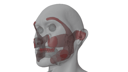 Trigger points or overworked areas of the masseter can refer pain to the top and bottom molar areas of the teeth. The following image shows the referral pattern of the masseters trigger points. The strong darker red color represents main pain referral sights of its trigger points while the lighter red color represents “spill over” pain from trigger points. Information used to construct the image is found in the latest version of Travell, Simmons & Simons’ Myofascial Pain and Dysfunction.