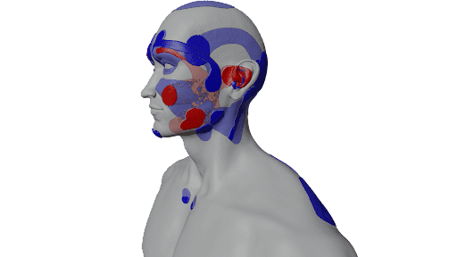The following diagram shows how this is possible. The blue tones represent trigger points from the trapezius and sternocleidomastoids-aka neck muscles. The red tones represent trigger points masseter muscles. Other muscles stated above also have trigger point patterns to the jaw head and neck areas. Refer to Travell, Simmons & Simons’ Myofascial Pain and Dysfunction for more details.5